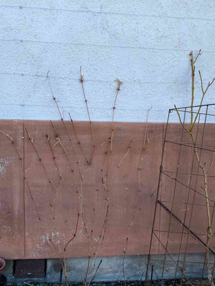 壁面にビシっと咲いてもらおうと、ワイヤー張って誘引しました。