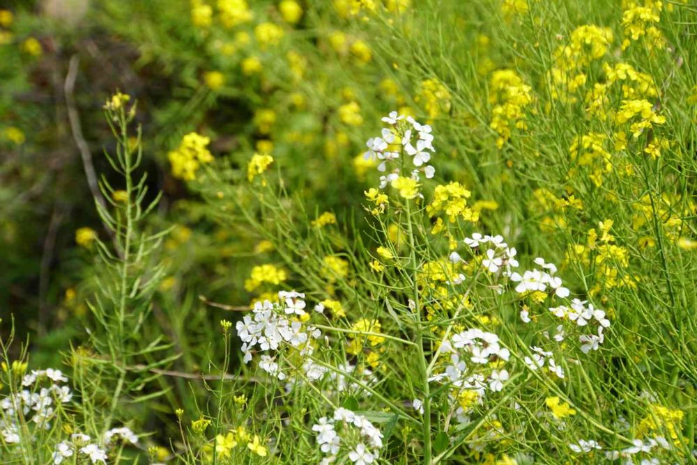 黄色い菜の花の中に白い花が綺麗に咲いてました。