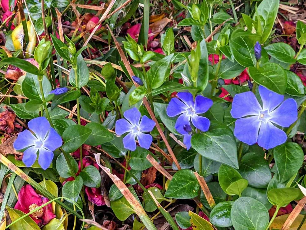 久し振りに大薮椿の下を見るとツルニチニチソウが我が世の春とばかりにあちらにもこちらにも…。今日投稿者さんと、このお花のお話をしたばかりでしたのでビックリしました。写真になるとどうしても青色になってしまい、実物に近付くように紫の方に寄せてはみましたが、はて、うまく行ったでしょうか…?🤔💜