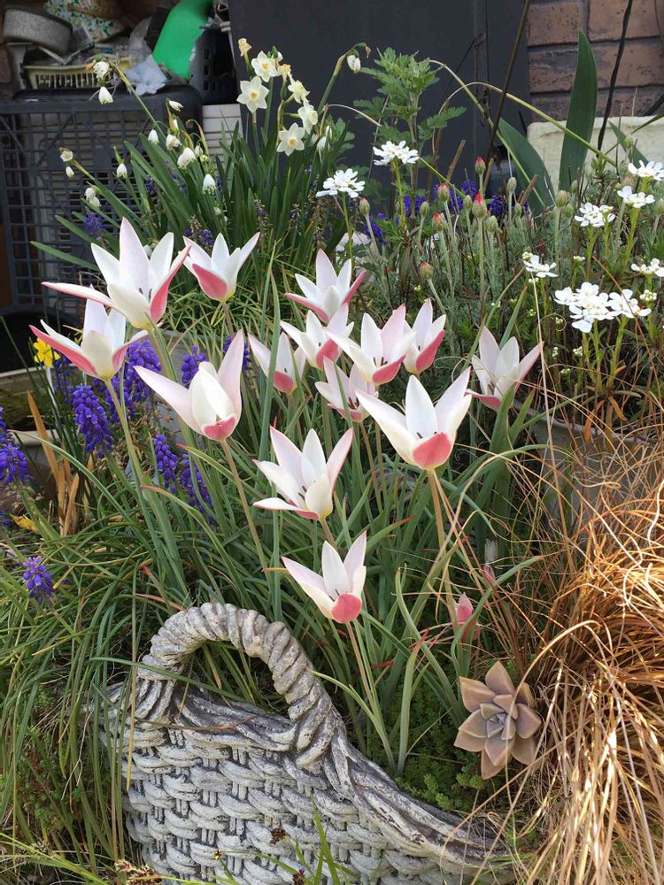 毎年咲いてくれるチューリップのカゴです♪。今年は何で 多肉が入ってんの?外組だったのにね。