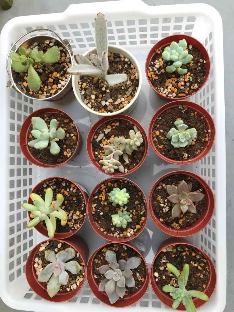 小さい多肉ちゃん、少しずつ集めたものをひと回り大きい鉢に植え替えました☺️