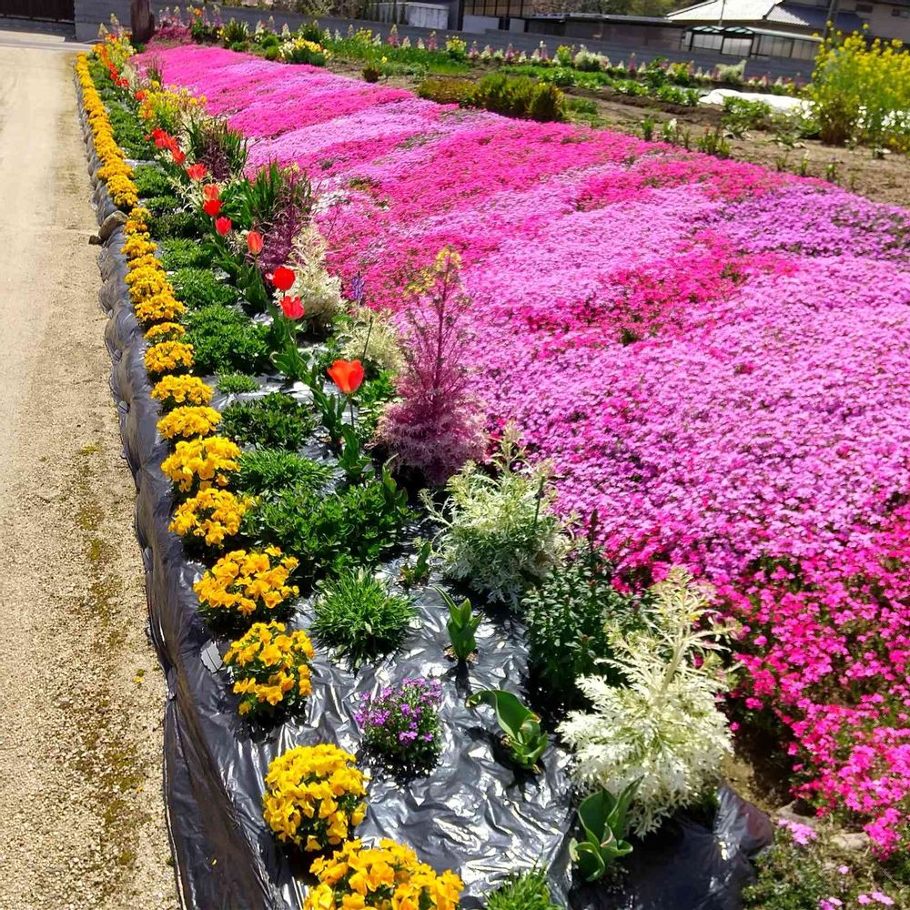 前列から黄色いパンジー、ウサギノオとシレネが交互に、赤い🌷など色と高さを考えてすばらしい‼️です。