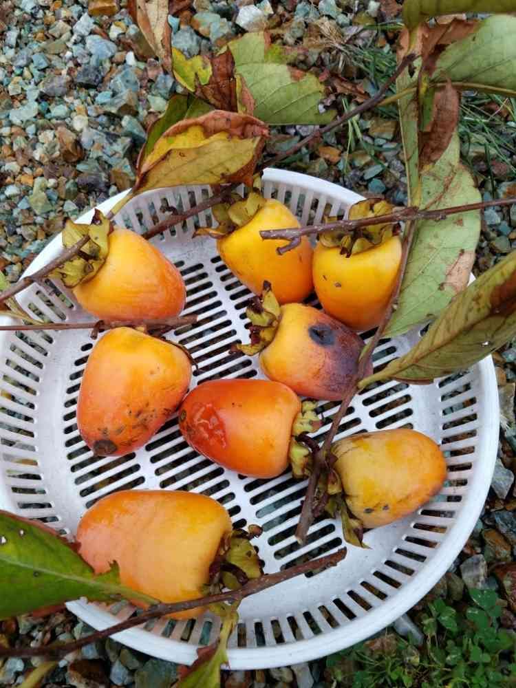 子どもが小さい頃に食べた柿の種を庭に埋めたのが大きくなって実をつけるようになりました。