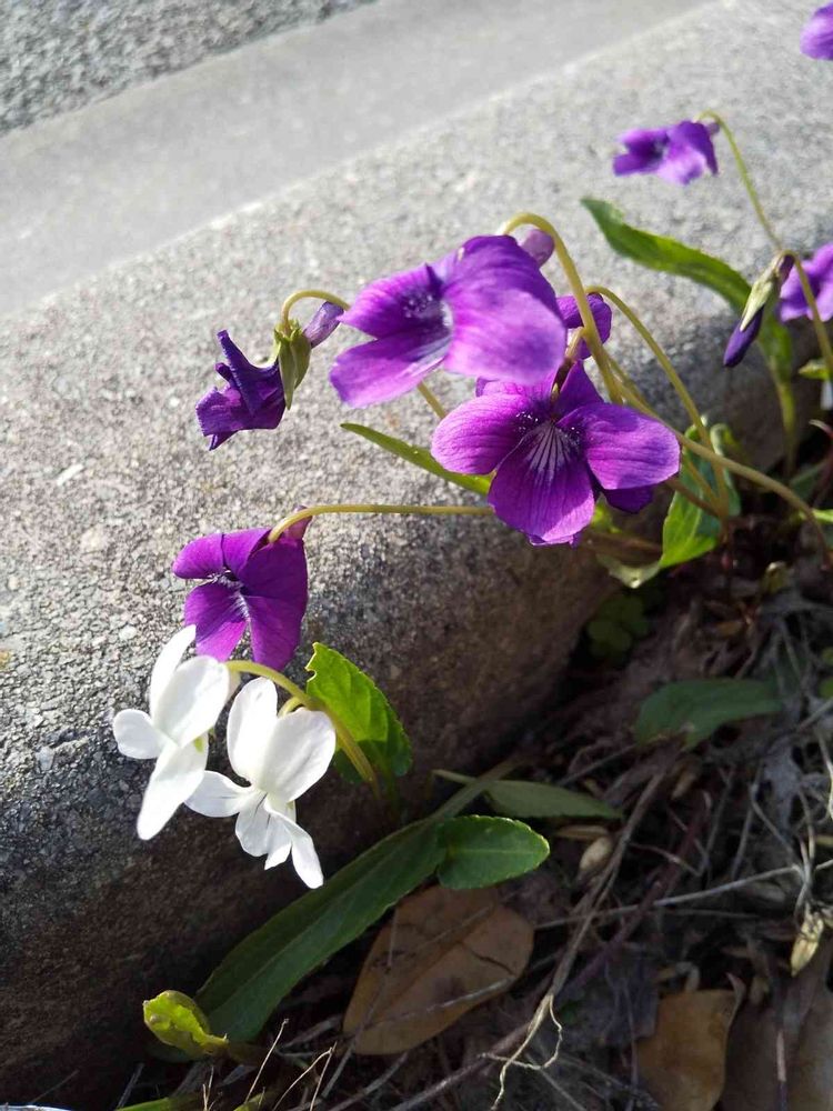濃い紫と白いスミレコラボで咲いてました…美しいスミレさん…ど根性スミレ…