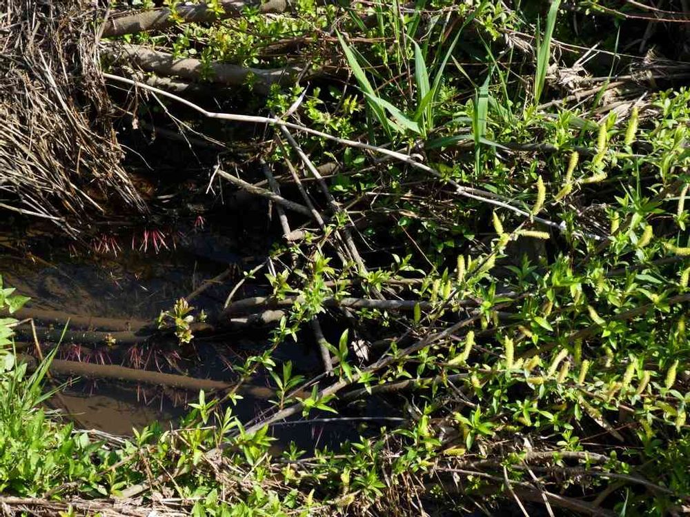 お友達と散歩中、大きな溝川に横たわる猫柳のような植物を発見。