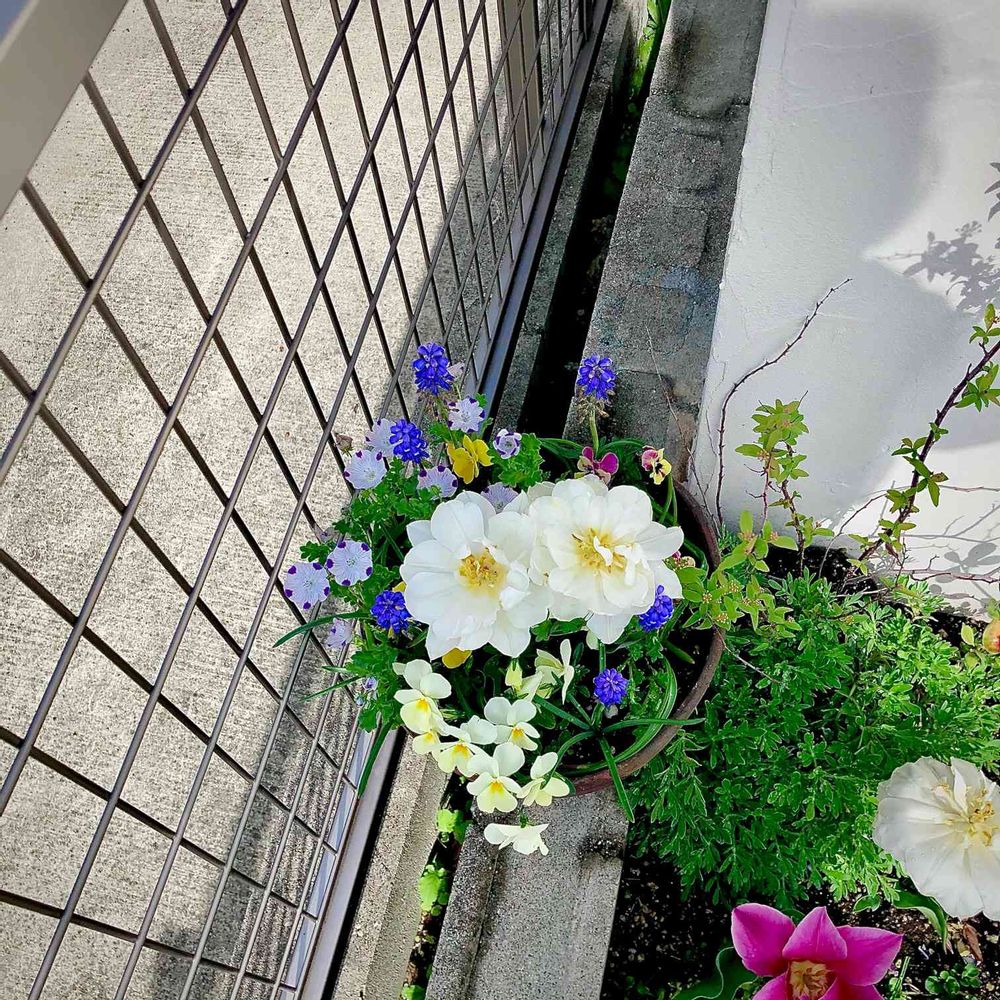 咲き揃いました。ビオラ三種類 種まきマキュラータムスカリと八重咲き白チューリップ でもなんだかまとまりない感じに💦 今年は、同じ品種のチューリップもばらばらに咲きなかなか上手くいきませんでした💦