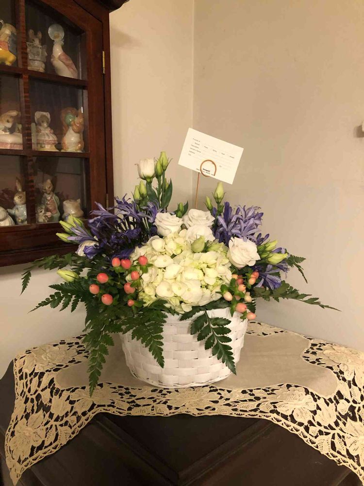 花材: アジサイ、八重咲きトルコキキョウ、ヒペリカム、アガパンサス、レザーリーフファーン