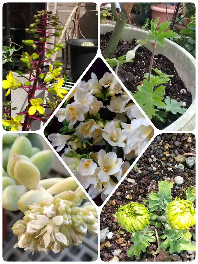 右上から時計まわりに、昨日の原種アネモネ、寒くて寸足らずのガーベラ、多肉クラバツム、葉牡丹光子、フリージアです。