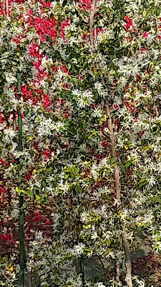 今朝も孫と散歩中、農家さんの畑で見つけたナンジャモンジャの木です。白と赤の花が入り混じってきれいでした。因みに、ナンジャモンジャと言う名は愛称で、モクセイ科のヒトツバタゴが正式名称らしいです。