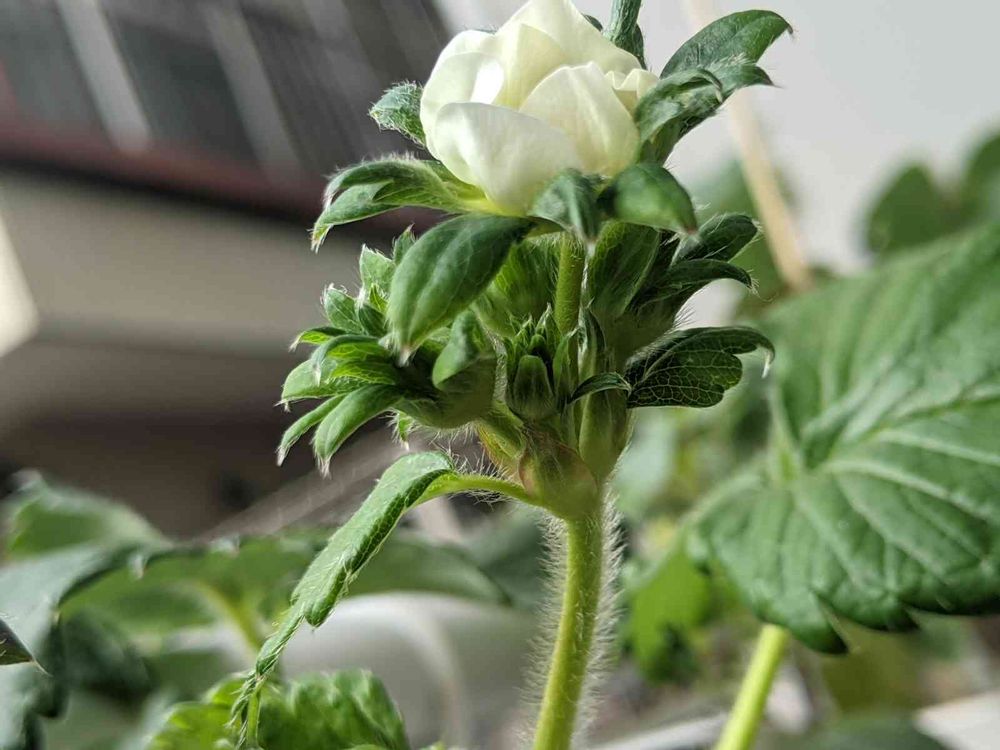🍓の花、ほぼ咲いてるし(上から見たら雄しべも見える)