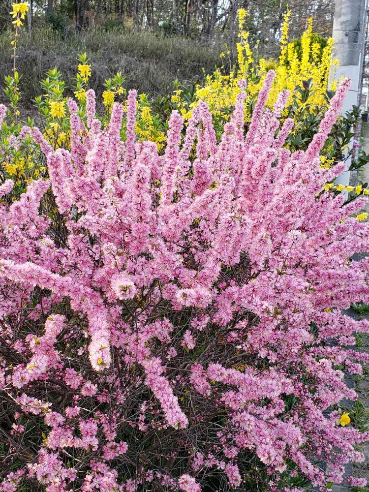 黄色いレンギョウをバックにピンクの尻尾が林立している。