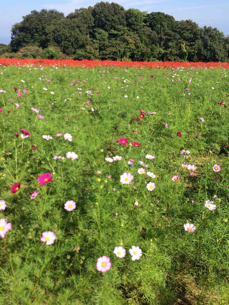 あわじ花さじきに行ってきました。コスモス畑はまだ咲き始めで、控えめな可愛らしさでした。奥に見える赤いラインはサルビアです。