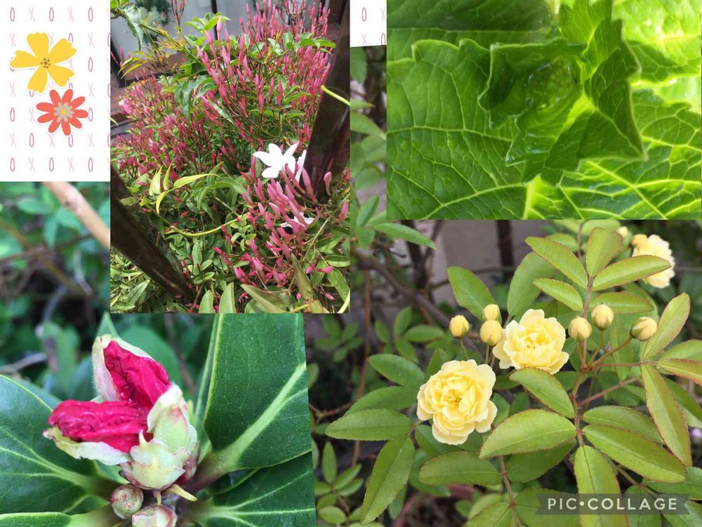 アジサイの中を覗くと小さな蕾が見えました。昨日まで見え無かった、石楠花の赤が見えました。ジャスミンとモッコウバラも蕾が開いて来ました。金曜日の蕾達に参加します。