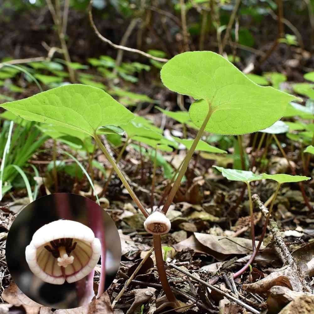 葉の大きさは約4~8cm。呼び鈴のような形をした約1.5cmの花が、うつむくように下を向いて咲く。色は紫がかった茶色で、外側は白い。葉のもとの部分に1個だけ付く。
