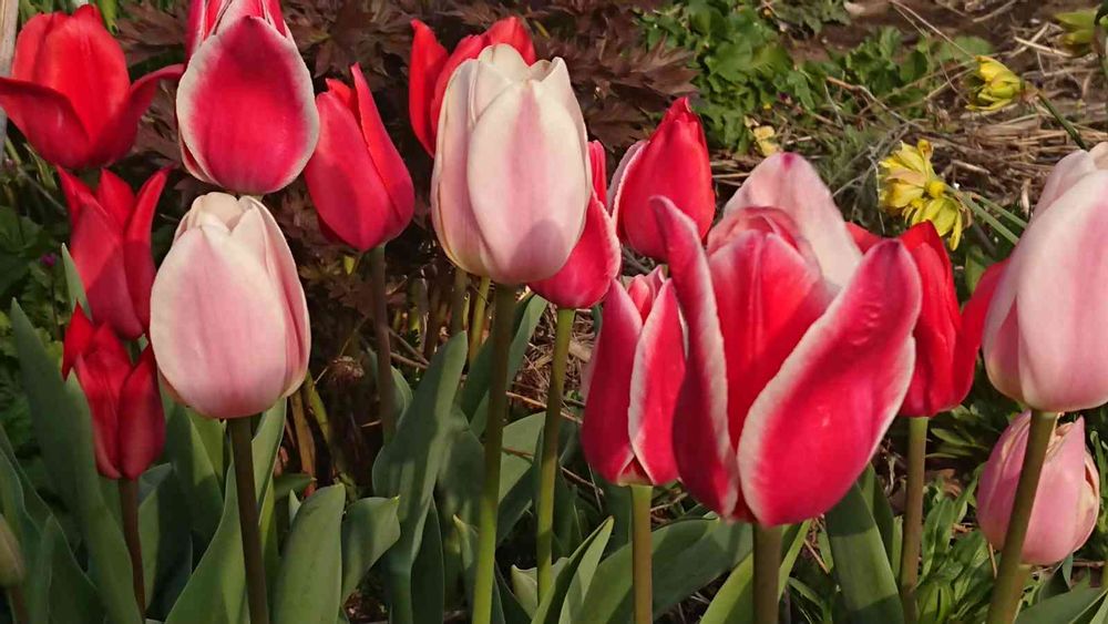 うわー!赤と薄いピンク色のチューリップ🌷とても華やかに見えます🤩