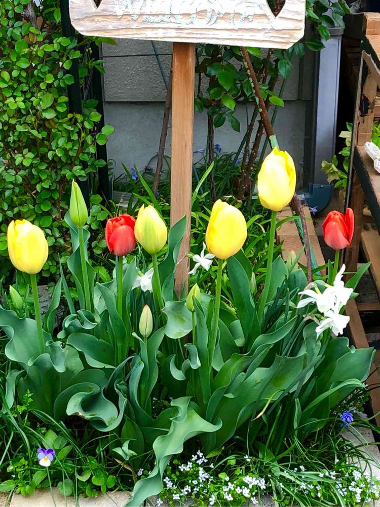 モッコウバラのアーチの下に植えたチューリップ🌷が 咲いたよ🎶🎶