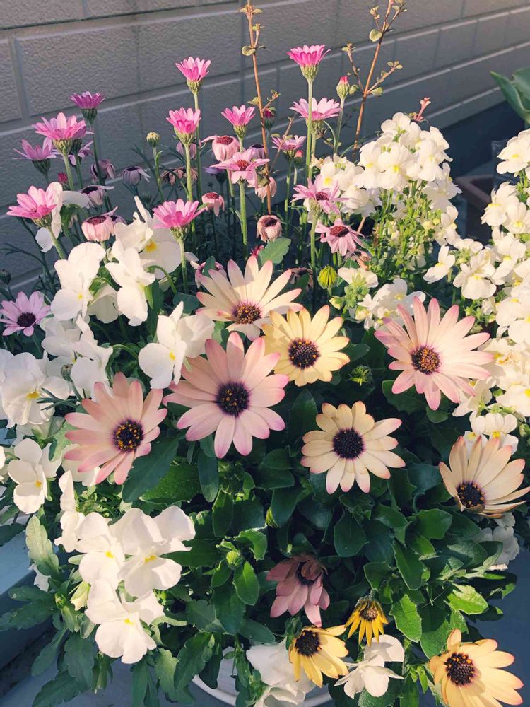 ようやく、寄せ植えの花が咲き揃ってきたので、全体像をお披露目😊