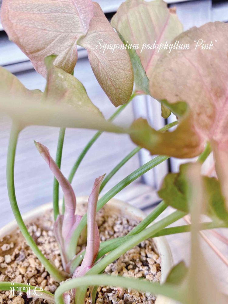 小さいほうのシンゴニウムピンクの新葉がクルックルッと🎶