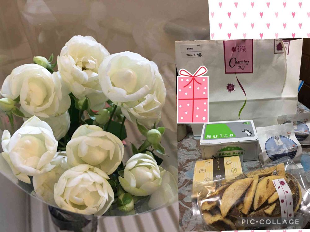娘が買ってきてスプレーバラ🌹。白くてカーネションみたいな優しいバラです。セールしてたと言ってお菓子詰め合わせも買って来きてくれました。^o^