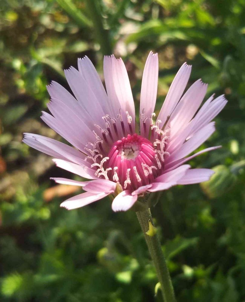 モモイロタンポポの、今回の写真は1番外側の花がぐるりと開いた所で、シベがそれぞれの花(舌状花)に1個ついてるよね!