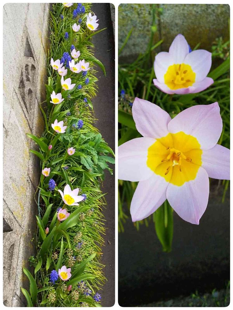 細い葉で狭い所に咲いているのはタマスダレのような花かと思い撮影しました。花の名を教えて頂いてからよく見ると、チューリップ🌷の葉が見えますし、花の中もタマスダレとは違います。