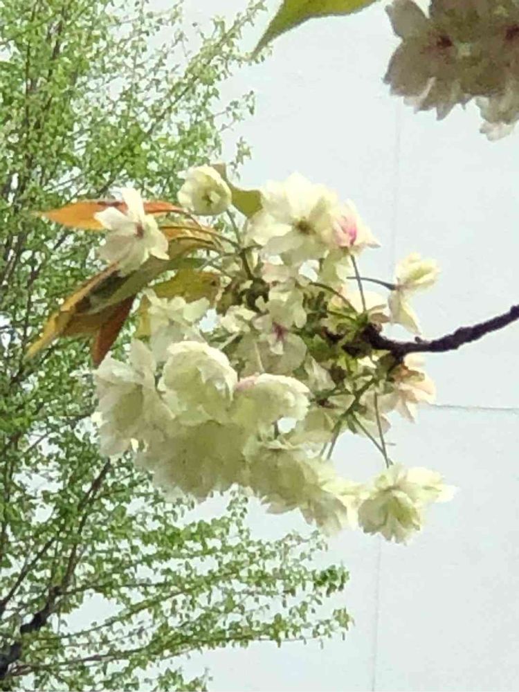 素敵な桜だったので、実物を見たいと思ってました。近くの児童館に向う途中似た感じの桜が咲いてたので、改めて次の日にワンコと散歩にでかけ(ちょっと遠目)見てきました。同じ花ではないと思うますが、八重桜はピンクばかりだと思っていたので、嬉しかった。町から出ることがないので、近場にも綺麗な花がある事知りました。
