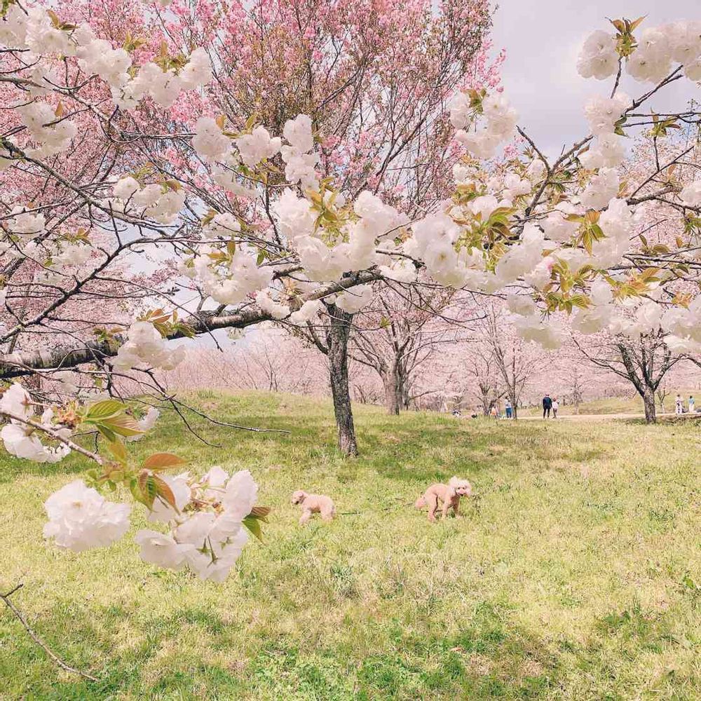 ワンちゃんも可愛いし、後ろの桜のピンクもキレイだし、手前の白も可愛い♡♡写真、上手ですね~