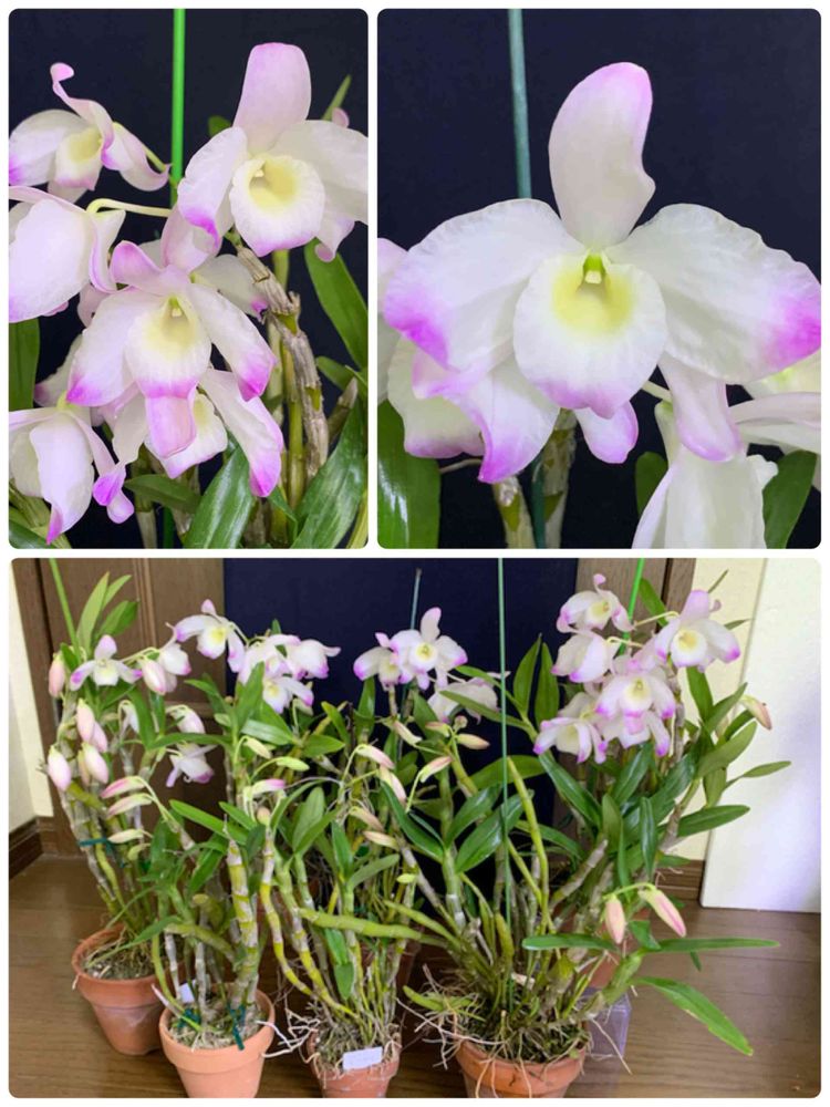 家のデンドロノビル系では1番の遅咲きです。抱え咲きでほんのりピンクが入る、古くからある品種です。