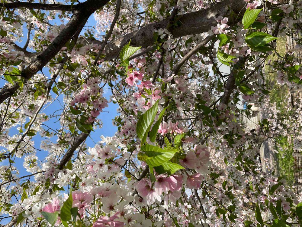 桜だと思うのですが、ピンクと白、二色の花があって面白いと思いました。