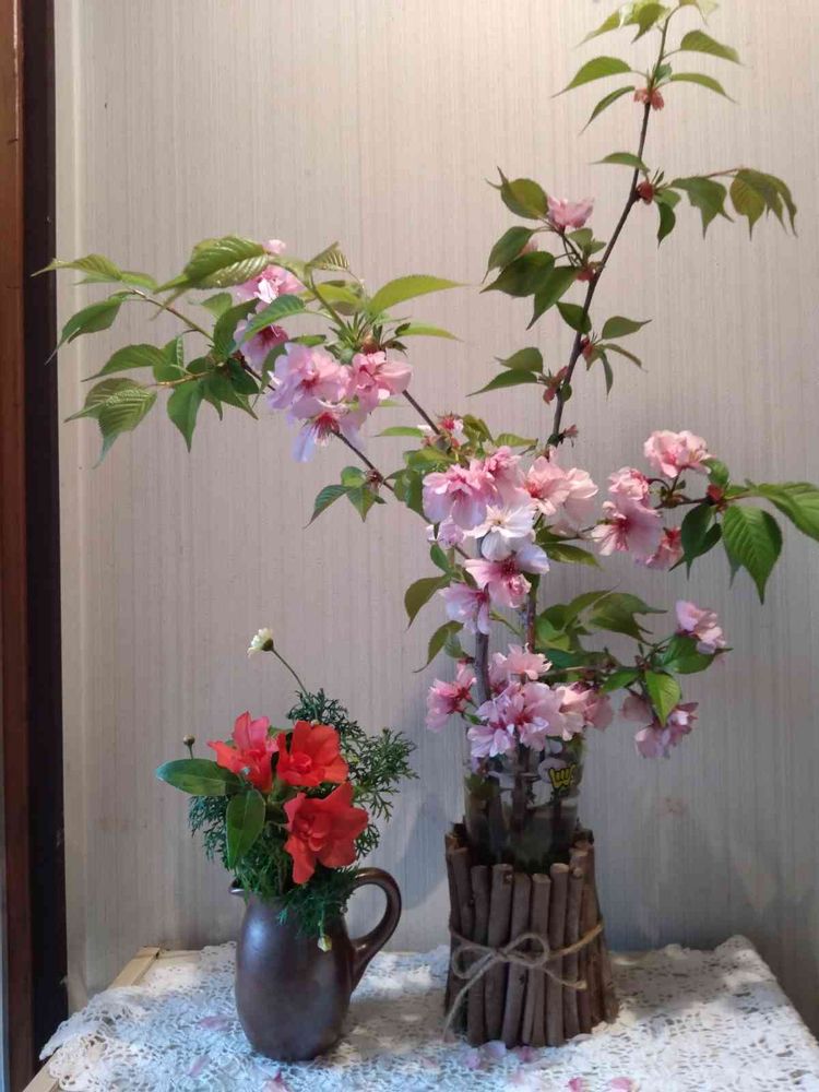 花器に枝をぐるっと巻いてあるんですね👍🌸