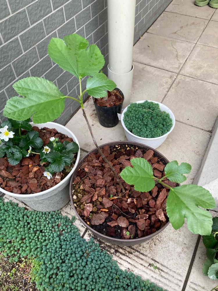 ミニいちじくの葉が元気に開いています。となりのいちごは何の種類でしたか、、、忘れてしまいました。