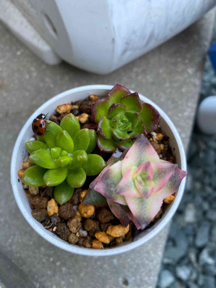 直径3センチ程のプラ鉢の寄植え作成後、小さな訪問者🐞現る🤗