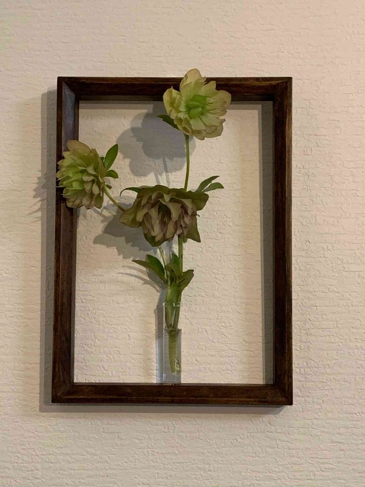 クリスマスローズを全部花切りしてきたうちの一つを壁掛け一輪挿しに飾りました☺️