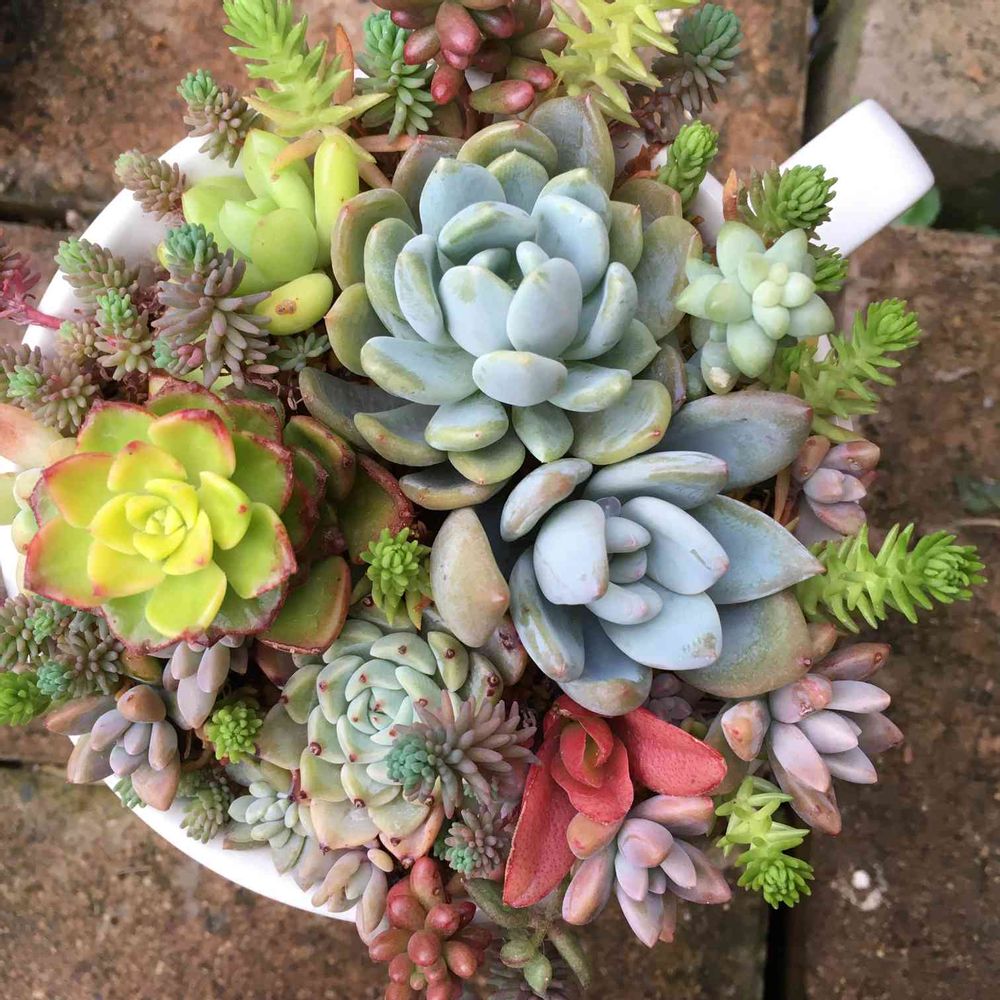 多肉熱再燃後の久しぶりの寄せ植え1号。古参の青白い子たちは名なしできた子。名前も知りたいんだよなぁ、だって可愛い♡可愛い子の名前は知りたい!