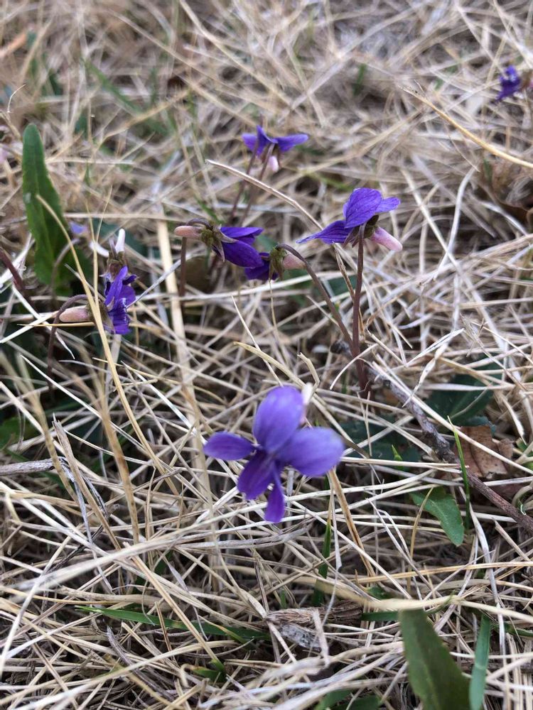明るい土手に小さな濃い紫色のスミレがたくさん咲いていました💜