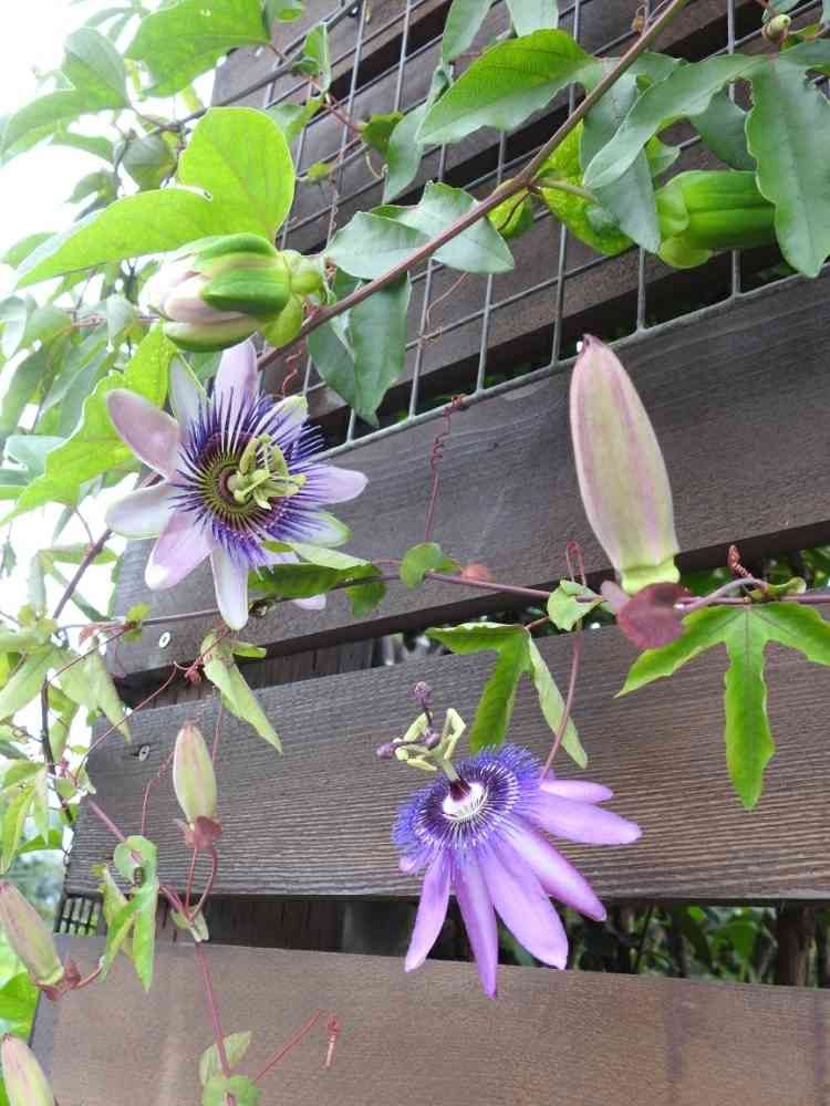 この写真は2週間ちょっとくらい前のだけど、二種類の時計草が咲いています😄