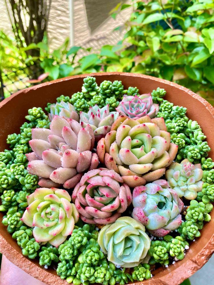 昨日到着したカット苗のエケベリアさん達と、我が家の多肉棚の斑入り(斑消え気味)のタイトゴメさんのカット苗を寄せ植え🤗🥗