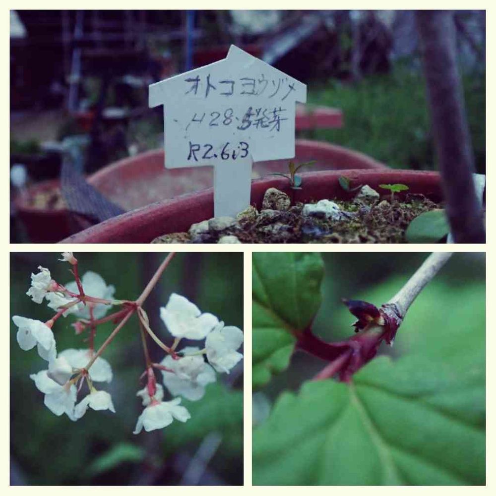 岩尾根に多い。少数の花(花径5~7mm)を下向きに咲かす、葉を別ける所が赤黒い、ヨウゾメはガマズミの地方名、ガマズミ程には役に立たないので オトコ がついた。平成28年発芽、やっと咲いた。
