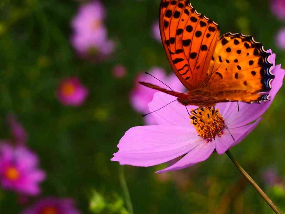 こんばんは、コスモスにオレンジ色のチョウチョ
