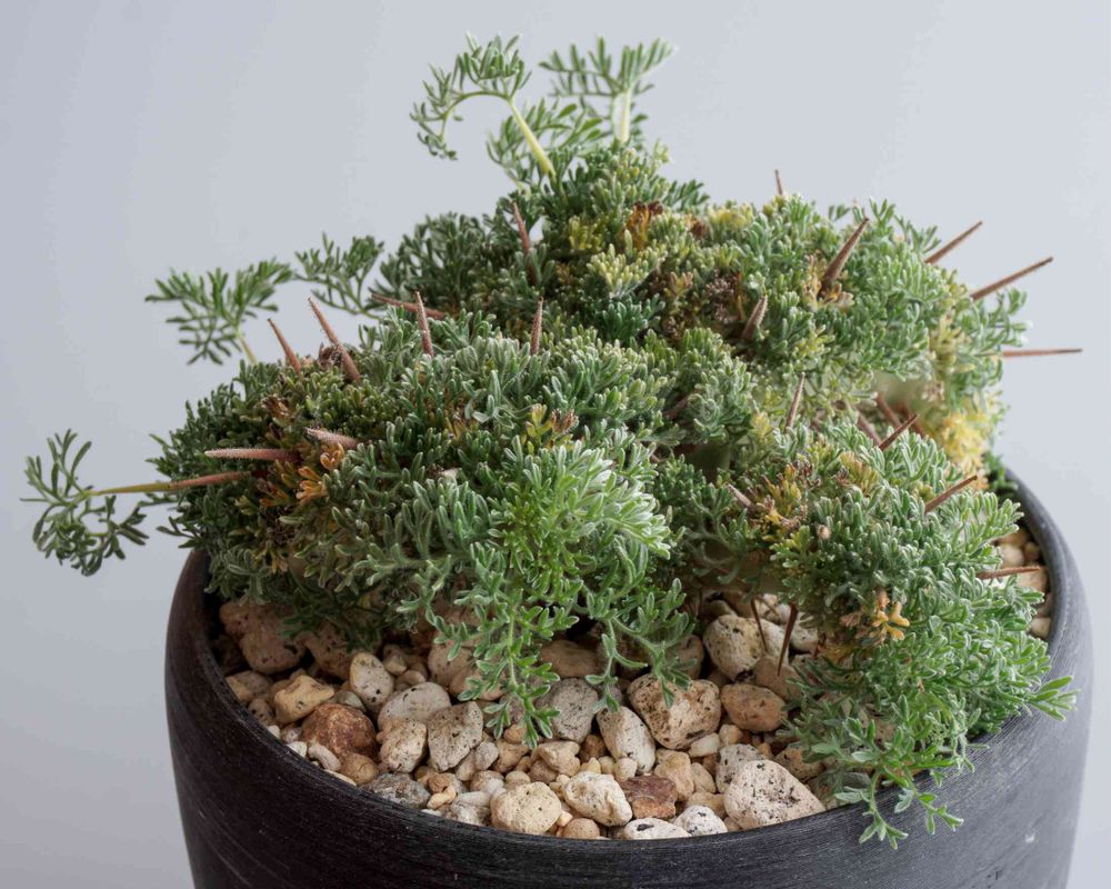 Monsonia herrei(Sarcocaulon herrei) 昨年7月発芽の実生苗 這うように伸びた枝が鉢の縁にぶつかったため植え直しています