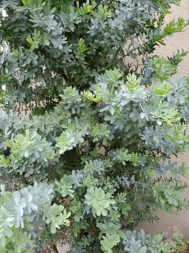 ギンヨウアカシア(ミモザ)の花期は3〜4月ですが、銀色がかった葉の先に若緑色の葉が出ていますね。😃