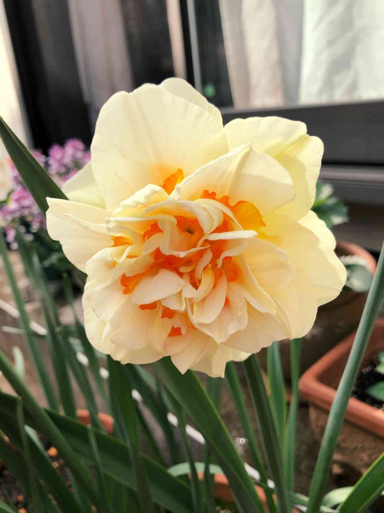 白の八重咲き水仙の中から、クリーム色の水仙も咲きました♡