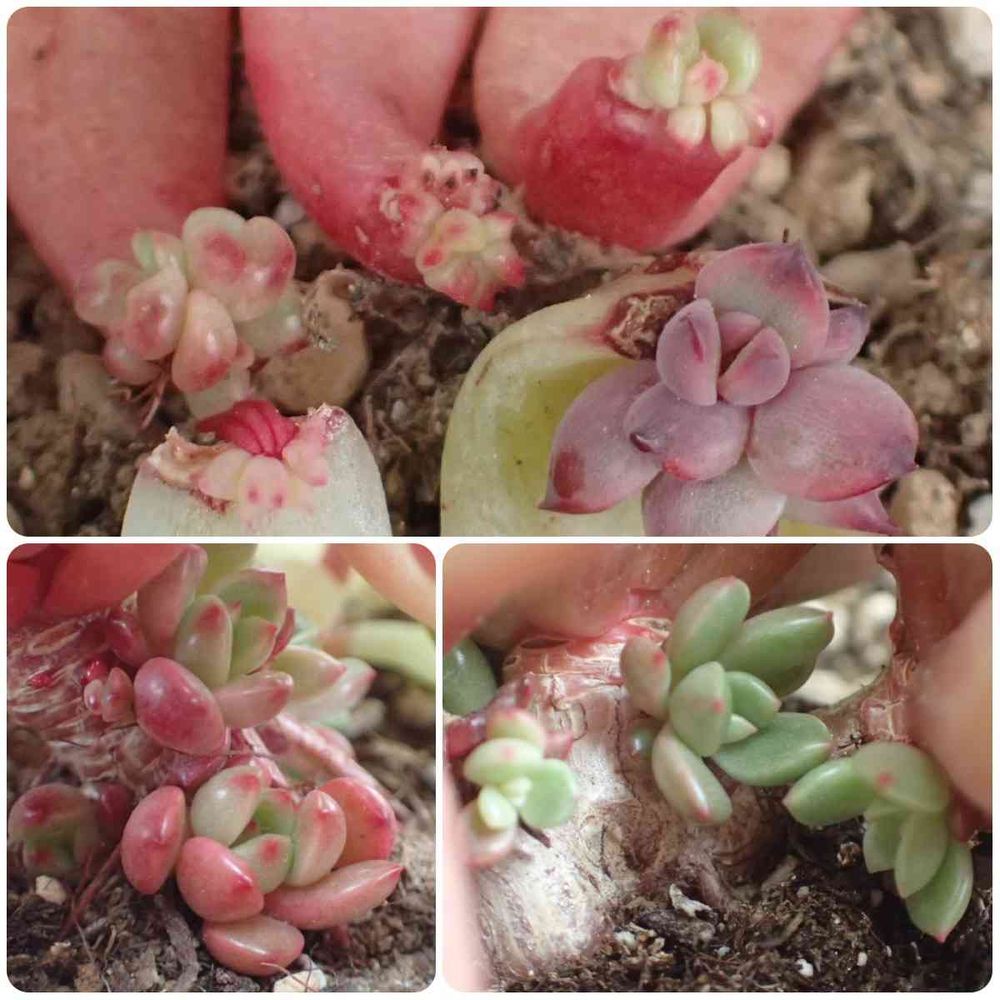 私が買った子は紅葉が今一つ💧この子の葉を外して葉挿してみたら👶赤い芽が出て育っているけど…親株と子供が違う色しているって