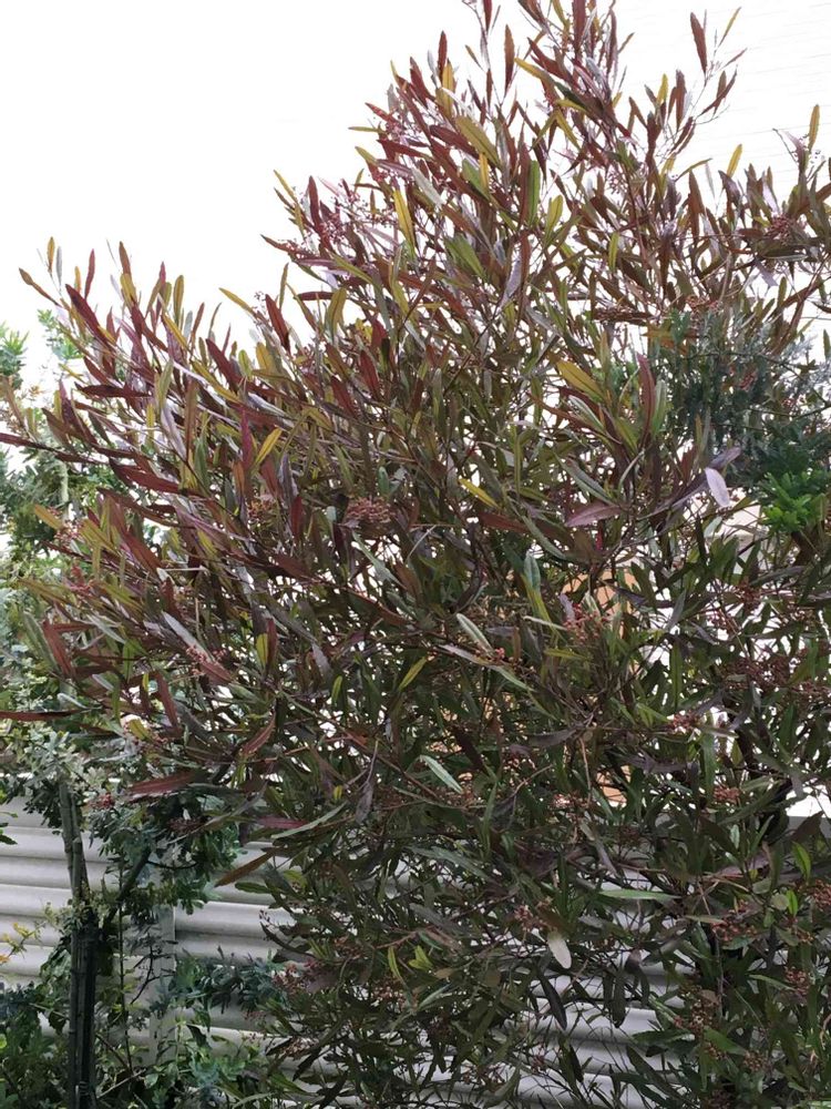 庭にある低木です。赤い小さな蕾をつけています。木の名前が知りたいです。