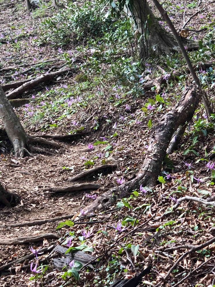 見難いですけどピンチアウトしてみて下さいな。踏み潰さないように歩くカタクリだらけの登山道😍