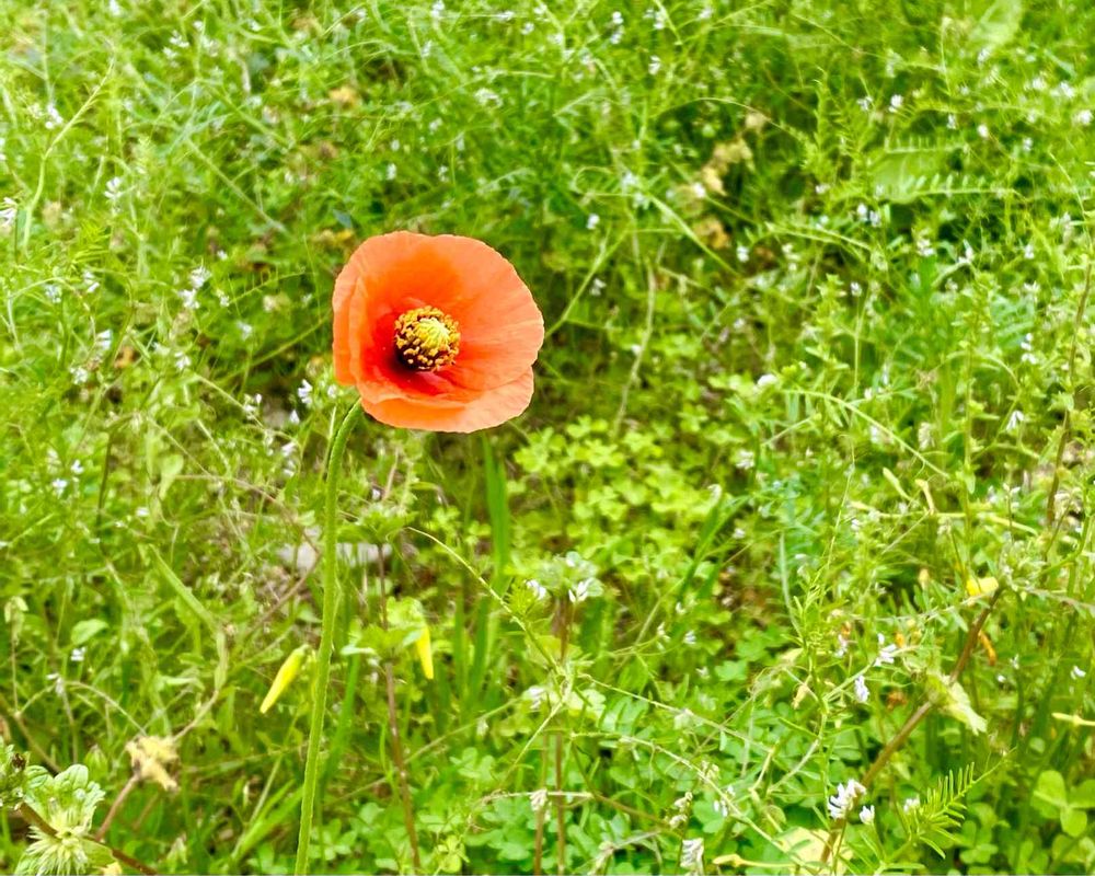 今年、初めて見かけたナガミヒナゲシ(長実ひな芥子)です。スズメノエンドウが広がる空き地にポツンと一本・・可愛い😍