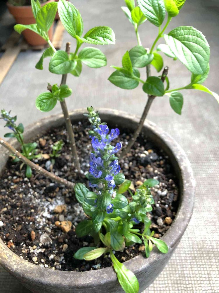 水やりを忘れないように足元に植えたアジュガ チョコレートチップも咲いてきて、一気に鉢が春らしくなって嬉しいです🌱