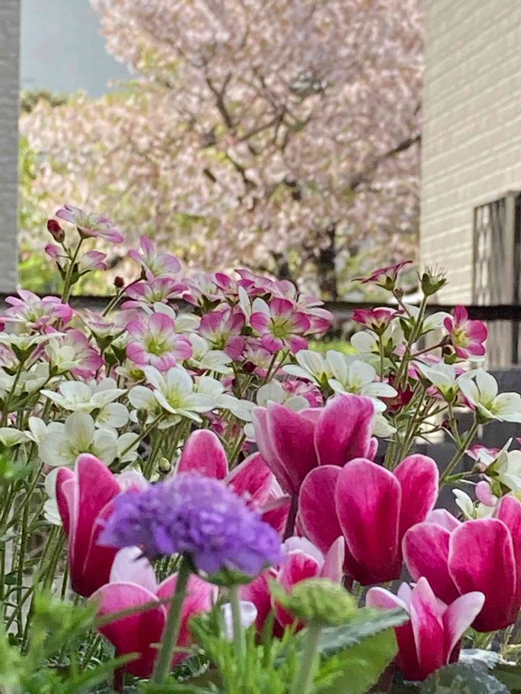 満開の桜🌸をバックに沢山のお花が咲き揃うお庭素敵ですね!