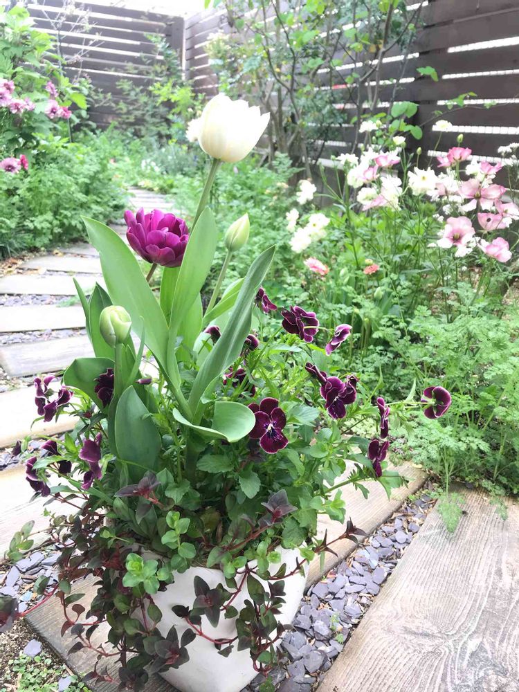 ラベンダー𓇬オレガノ𓇬リシマキアを合わせた寄せ植えのラベンダーが枯れたのでビオラとチューリップがご参加¨̮ ¨̮ ¨̮