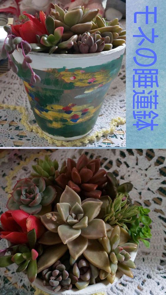 娘がモネの池の鉢をお絵描き教室で作ってくれたのでやっと寄せ植え出来ました